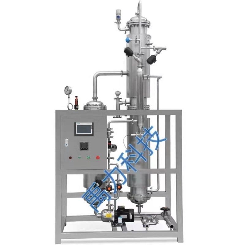 合格的原料水由多級泵增壓后經(jīng)流量計進(jìn)入預(yù)熱器,經(jīng)熱交換后溫度可比蒸發(fā)器加熱蒸汽低10-15℃, 然后進(jìn)入在蒸發(fā)器經(jīng)料水分配器噴射在加熱管內(nèi)壁,使料水在管內(nèi)成膜狀流動,被鍋爐蒸汽汽化,產(chǎn)生的夾帶水滴的二次蒸汽,從加熱管下端進(jìn)入三級分離裝置,被分離后生成純蒸汽??梢栽诰€檢測純蒸汽冷凝水的電導(dǎo)率,從而檢驗(yàn)純蒸汽是否合格。鍋爐蒸汽的蒸發(fā)器被原料水吸收熱量冷凝后,凝結(jié)成鍋爐蒸汽凝結(jié)水,作為預(yù)熱器的加熱熱源,預(yù)熱的原料水zui后從預(yù)熱器不凝結(jié)水排水口排出。