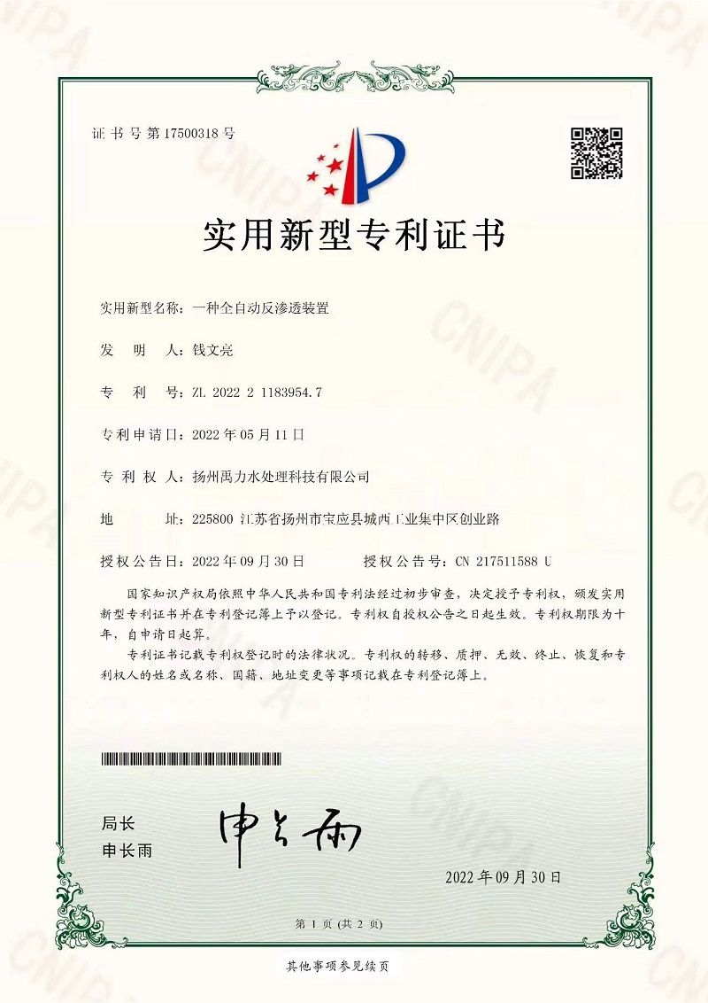全自動(dòng)反滲透裝置專(zhuān)利證書(shū)